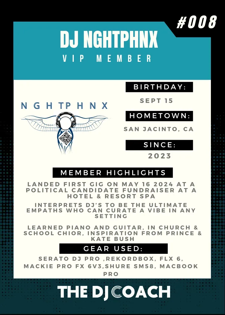 DJ NGHTPHNX played their first gig on May 16, 2024, at a political candidate fundraiser held at a spa resort. They are eager to continue performing and sharing their musical talents with more audiences.