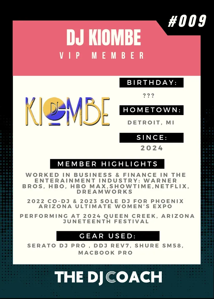 DJ Kiombe’s gigs include co-DJing and solo DJing for The Phoenix Arizona Ultimate Women’s Expo at the Phoenix Convention Center, a prom send-off in Santa Monica, CA, various local birthday parties, and co-DJing at a high school prom. She is also booked for the 2024 Queen Creek, Arizona Juneteenth Festival.